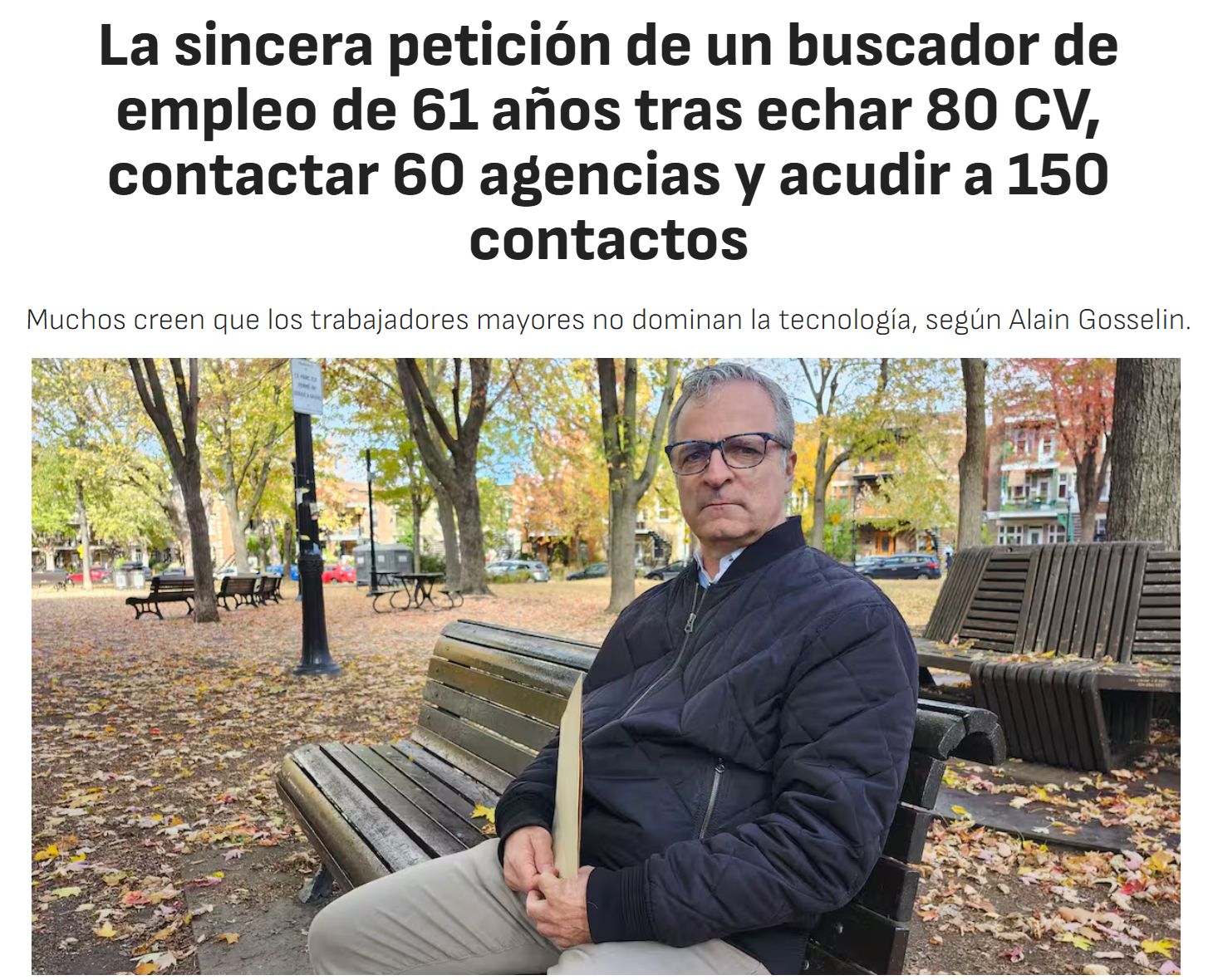 🙏 “𝗛𝗲 𝗲𝗻𝘃𝗶𝗮𝗱𝗼 𝟴𝟬 𝗖𝗩, 𝗰𝗼𝗻𝘁𝗮𝗰𝘁𝗮𝗱𝗼 𝟲𝟬 𝗮𝗴𝗲𝗻𝗰𝗶𝗮𝘀 𝘆 𝗵𝗮𝗯𝗹𝗮𝗱𝗼 𝗰𝗼𝗻 𝟭𝟱𝟬 𝗽𝗲𝗿𝘀𝗼𝗻𝗮𝘀. 𝗦𝗼𝗹𝗼 𝗽𝗶𝗱𝗼 𝘂𝗻𝗮 𝗼𝗽𝗼𝗿𝘁𝘂𝗻𝗶𝗱𝗮𝗱” Este es el grito silencioso de Adam, 61 años, exdirector de RRHH, ahora buscador de empleo. Y no es un caso aislado. ¿Qué nos dice su historia? • Que 𝗹𝗮 𝗲𝘅𝗽𝗲𝗿𝗶𝗲𝗻𝗰𝗶𝗮 𝗻𝗼 𝗴𝗮𝗿𝗮𝗻𝘁𝗶𝘇𝗮 𝗲𝗺𝗽𝗹𝗲𝗼    • Que 𝗹𝗮 𝗲𝗱𝗮𝗱 𝘀𝗶𝗴𝘂𝗲 𝘀𝗶𝗲𝗻𝗱𝗼 𝘂𝗻 𝗳𝗶𝗹𝘁𝗿𝗼 𝗶𝗻𝘃𝗶𝘀𝗶𝗯𝗹𝗲    • Que 𝗹𝗮 𝗯𝘂́𝘀𝗾𝘂𝗲𝗱𝗮 𝗮𝗰𝘁𝗶𝘃𝗮 𝗽𝘂𝗲𝗱𝗲 𝘃𝗼𝗹𝘃𝗲𝗿𝘀𝗲 𝗱𝗲𝘀𝗲𝘀𝗽𝗲𝗿𝗮𝗻𝘁𝗲, incluso con contactos, formación y actitud    • Que 𝗲𝗹 𝗺𝗲𝗿𝗰𝗮𝗱𝗼 𝗹𝗮𝗯𝗼𝗿𝗮𝗹 𝗻𝗼 𝘀𝗶𝗲𝗺𝗽𝗿𝗲 𝗿𝗲𝗰𝗼𝗻𝗼𝗰𝗲 𝗹𝗼 𝗾𝘂𝗲 𝗻𝗼 𝗲𝗻𝗰𝗮𝗷𝗮 𝗲𝗻 𝘀𝘂𝘀 𝗺𝗼𝗹𝗱𝗲𝘀 Adam no se queja. No exige. Solo pide que alguien le escuche. Y lo hace con una frase que responde perfectamente a la dichosa pregunta "por qué deberíamos contratarte?". “𝗡𝗼 𝗾𝘂𝗶𝗲𝗿𝗼 𝗾𝘂𝗲 𝗺𝗲 𝗿𝗲𝗴𝗮𝗹𝗲𝗻 𝗻𝗮𝗱𝗮. 𝗦𝗼𝗹𝗼 𝗾𝘂𝗶𝗲𝗿𝗼 𝗱𝗲𝗺𝗼𝘀𝘁𝗿𝗮𝗿 𝗾𝘂𝗲 𝗽𝘂𝗲𝗱𝗼 𝗮𝗽𝗼𝗿𝘁𝗮𝗿.” Llegados a este punto, quizás el problema no es el candidato, sino el sistema. Si tras 80 CV, 60 agencias y 150 contactos no hay respuesta, quizás el (des)ajuste no está en él, sino en cómo se mira a quienes buscan empleo con más de 50 años (e incluso con menos edad). La historia de Adam es la todas aquellas personas que siguen buscando sin que nadie les vea. ¡Que a nadie se le ocurra tirar la toalla! 💪 Fuente de la noticia en Diario AS: 🔗 https://lnkd.in/ex7Tyucb Pablo Cobisa